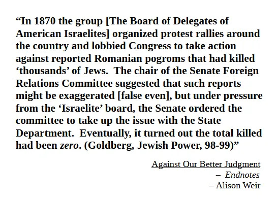 تفاصيل هذه الحالة النفسية موثقة في العديد من المجلدات البحثية العلمية. ومرة أخرى، تم عرضها واستنتاجها في الملحمة التاريخية المكونة من 6 مجلدات لإدوارد جيبون بعنوان تدهور وسقوط الإمبراطورية الرومانية (1776-1789)؛ وقد ”اكتشفها“ مؤخرًا علماء وآثاريون ومؤرخون يهود: يعرف معظم العالم الآن أنه لم تكن هناك مملكة إسرائيلية بالحجم السخيف الذي رسمه ثيودور هرتزل. وقد صرح المؤرخون والآثاريون والعلماء الإسرائيليون بواقعية أنه لم يكن هناك أي يشوع، ولا أسوار أريحا المنهارة، ولا داود، ولا سليمان، ولا عبودية جماعية لليهود في مصر، ولا المكابيين ولا انتحار جماعي في مسعدة، ولا الشتات، وبالطبع، ولا أخلاق. في الوقت الذي يفترض أن اليهود هربوا فيه من الفرعون، كانت أرض فلسطين بأكملها جزءًا من إمبراطوريته، ولا تعتقد أنه كان بإمكانه استعادة مثل هذا العدد الهائل من الناس ”الضائعين“ في صحرائه لمدة ”40 عامًا“؛ وأن موسى، الذي نشأ كأمير لتلك الإمبراطورية، وكان على دراية بمملكة الفرعون، كان غبيًا لدرجة أنه لم يستطع قراءة الشمس ومعرفة أي اتجاه هو الشمال؟ كل هذا مجرد حكاية خرافية لأغبياء مثلك، أيها الصهيوني؛ وبالطبع لأخوتك وأخواتك الأغبياء من المجتمع الصهيوني المسيحي. ما ثبت صحته هو ميل الصهاينة للكذب وخداع أنفسهم.