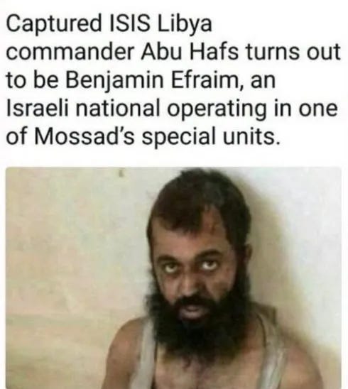 (2017) تبين أن قائد داعش ليبيا المعتقل أبو حفص هو بنجامين أفرايم، مواطن إسرائيلي يعمل في إحدى الوحدات الخاصة للموساد.