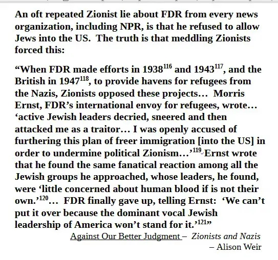 لكنك تعلم بالطبع أن الأساطير اليهودية مزيفة: ”اليهود ليسوا ’عرقًا‘“. اليهودية البيولوجية، أو الزويشية (انظر ندا شحادة)، ليست شيئًا حقيقيًا في الواقع، لأن اليهودية ديانة، وليس جينومًا بيولوجيًا، واليهود الأشكناز لا يحتويون على الحمض النووي الإسرائيلي القديم (لأنهم كانوا من الخزر الذين اعتنقوا اليهودية). اليهود الأشكناز هم من تحولوا إلى ”دين مات قبل مجيء يسوع“. أكثر من 80٪ من الفلسطينيين يحملون الحمض النووي الإسرائيلي القديم، وأكثر من 90٪ من اليمنيين يحملون الحمض النووي الإسرائيلي القديم، وعدد كبير من الإيرانيين يحملون الحمض النووي الإسرائيلي القديم؛ في حين أن 2.5٪ فقط من الإسرائيليين (المزراحي) يحملون الحمض النووي الإسرائيلي القديم. "لا يوجد أي حمض نووي يهودي؛ واليهود ليسوا عرقًا أو جماعة منعزلة؛ واليهود ليس لديهم سلف مشترك من بلاد الشام؛ ولم يؤدِ المنفى الروماني (70 م) إلى تأسيس الشتات اليهودي؛ ”اليهود الأشكناز“ لم ينشأوا من مجموعة مؤسسين صغيرة؛ جميع اليهود ليسوا أقارب لبعضهم البعض" [إيران الهايك، عالم الوراثة اليهودي المولود في إسرائيل، الذي قال، بالمناسبة، إن هاري أوستر كاذب — من دراسته الرائدة في جامعة جونز هوبكنز — الرومان، والسبارتانيون، والصهاينة، والعبودية]