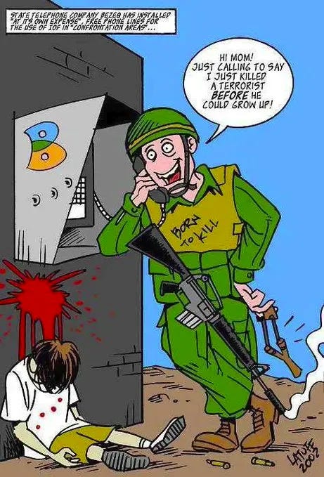 أنت تتبنى القتل: ”لم يكونوا يعرفون كيف يقاتلون، لكنهم كانوا جيدين جدًا في القتل“ (عقيد في الجيش الإسرائيلي مقتبس من Against Our Better Judgment). دائمًا ما يدهشني عدد الأشياء الغبية التي يقولها الصهاينة. الصهاينة ومدافعوهم يتهافتون حاليًا لتبرير القتل، كما لو أن هذا لا ينتهك بشكل فاضح معظم الوصايا العشر.