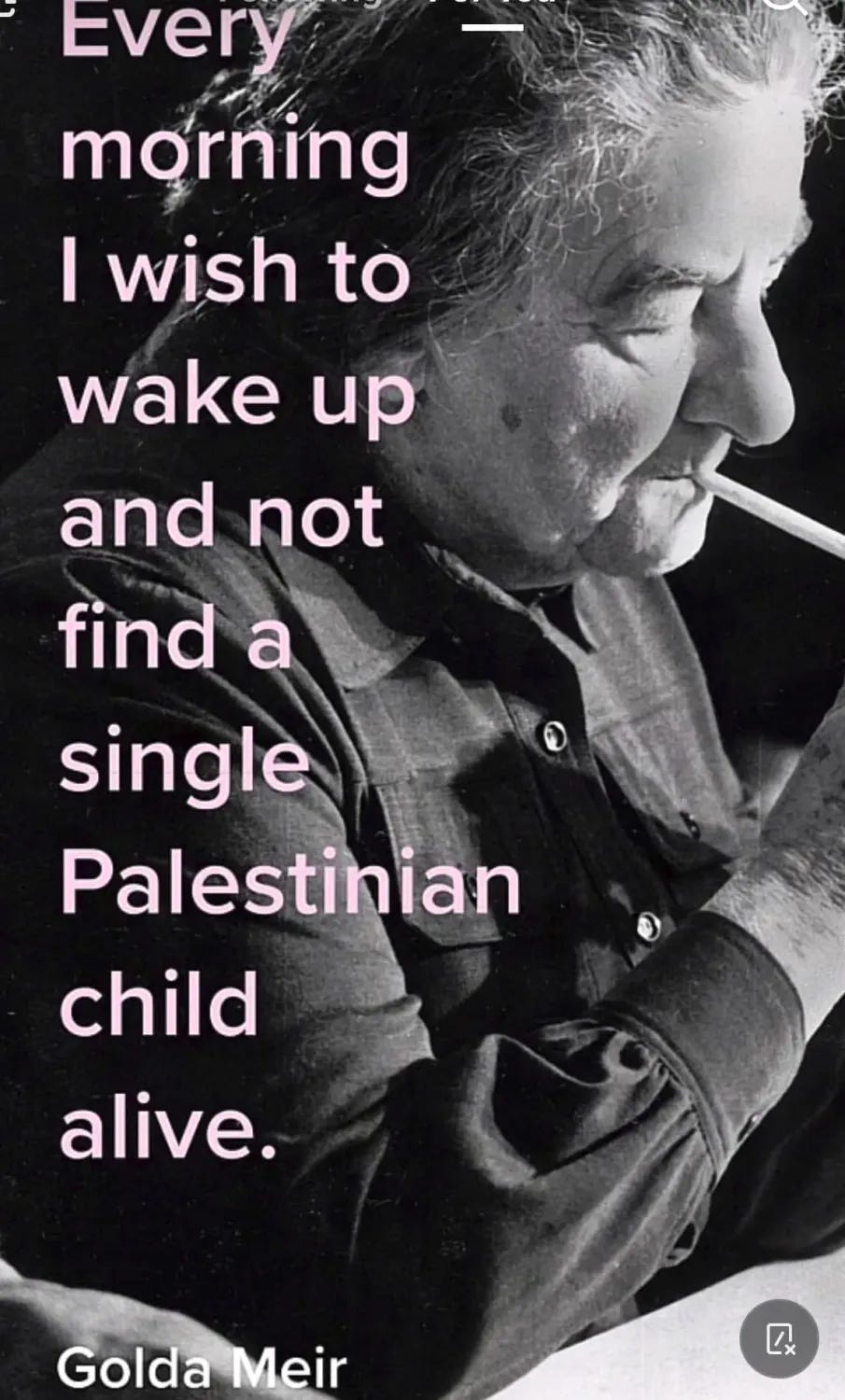 ”كل صباح أتمنى أن أستيقظ ولا أجد أي طفل فلسطيني على قيد الحياة.“ (غولدا مائير، في حديثها مع كاتب سيرتها الذاتية الصهيوني الذي أخبر الجميع)